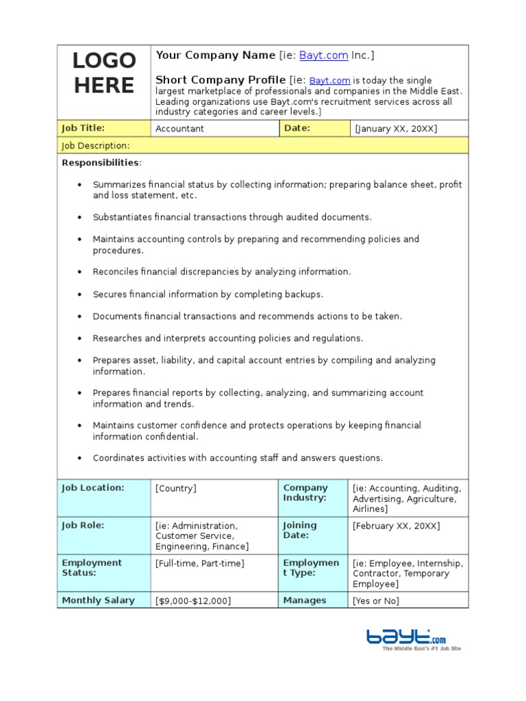 Accountant Job Description | Responsibilities, Duties ... from i2.wp.com Bjc job description of senior financial analyst provides analysis of financial data, including clinical service line reporting, trend analysis, proformas, and forecasts, and the monitoring of key financial metrics. 1 job description job title: Senior accountant 1 job description job title: Senior financial accountant job description. You maintain a ledger to ensure effectiveness and accuracy of all accounting tasks. Explain accounting procedures and discuss data anomalies or status. Job description job title senior management accountant group finance section finance responsible to financial controller responsibility for employees management accountants date 17 september 2014 job purpose this job is part of a team that provides for the council's day to day accounting and management reporting functions. Senior management accountant main areas of responsibility:
